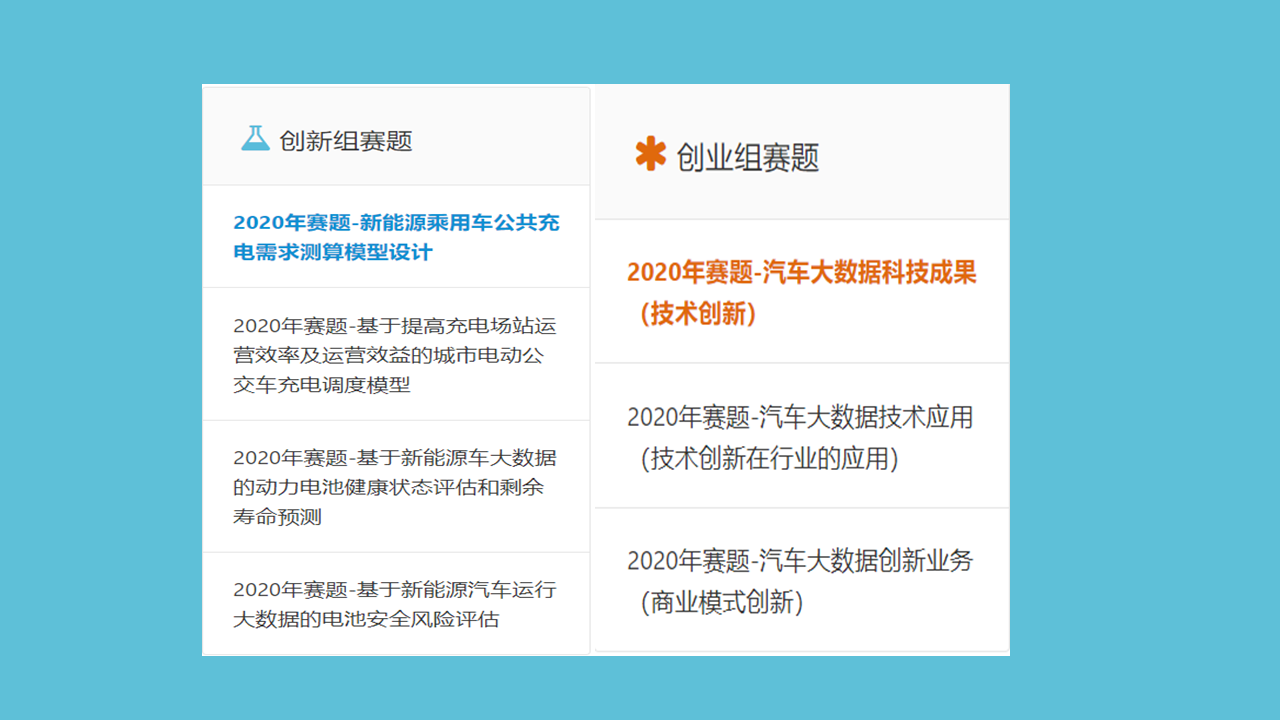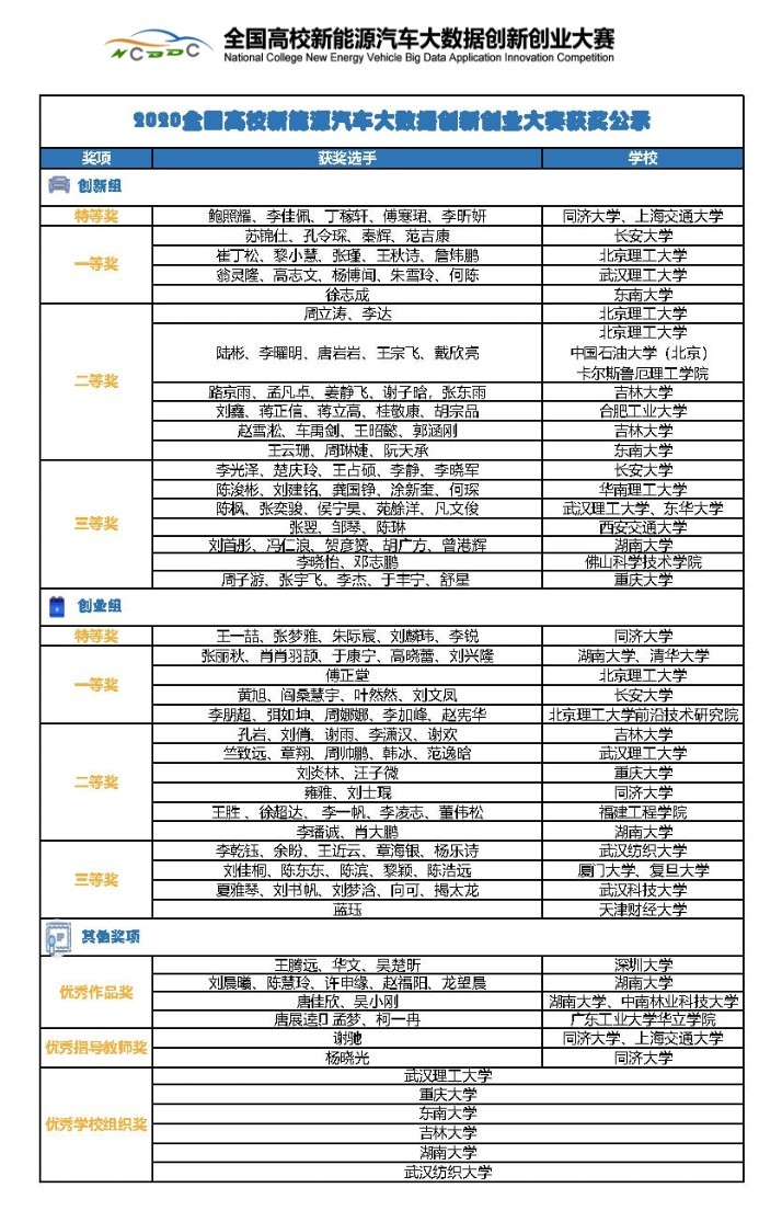 2020全国高校新能源汽车大数据创新创业大赛是新能源汽车国家大数据联盟连续三年举办的年度国际性高校赛事,大赛依托新能源汽车国家监管平台所接入近400万辆新能源汽车数据,以数据算法创新和数据分析应用为重点,通过挖掘数据价值,探索创新应用,进一步推动行业高端紧缺型人才的选拔,为有创新创业想法的学生提供支持平台。大赛期望与相关各方共同努力,打通学校-科研-企业-产品创新产业链,汇聚数字人才,促进高质发展。 大赛分为创新组及创业组两个组别,各设特等奖、一等奖、二等奖、三等奖等4个等级,并设置优秀奖、优秀指导老师奖及优秀学校组织奖。大赛经过线上初赛和复赛,遴选出33组团队进入决赛。12月6日-7日在广东省佛山市南海区举行大赛决赛及颁奖典礼。