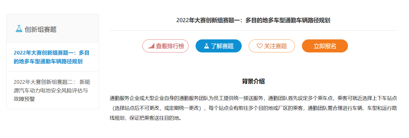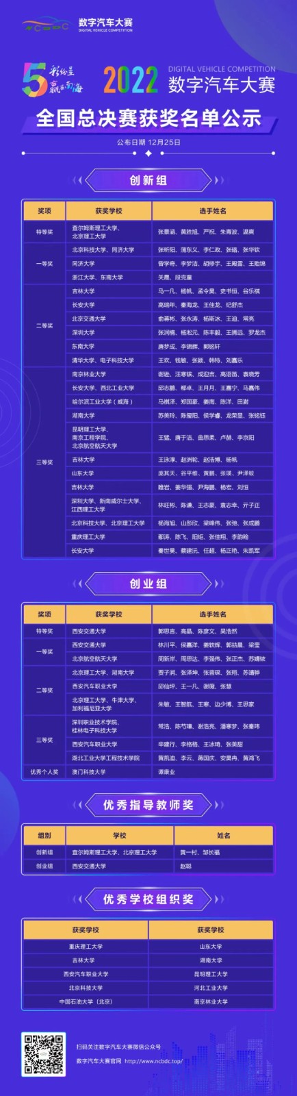 2022年数字汽车大赛是新能源汽车国家大数据联盟连续五年举办的年度国际性高校赛事,大赛依托新能源汽车国家监管平台所接入1000万多辆新能源汽车数据,以数据算法创新和数据分析应用为重点,通过挖掘数据价值,探索创新应用,进一步推动行业高端紧缺型人才的选拔,为有创新创业想法的学生提供支持平台。大赛期望与相关各方共同努力,打通学校-科研-企业-产品创新产业链,汇聚数字人才,促进高质发展。 大赛分为创新组及创业组两个组别,各设特等奖、一等奖、二等奖、三等奖等4个等级,并设置优秀奖、优秀指导老师奖及优秀学校组织奖。大赛经过线上初赛和复赛,遴选出32组团队进入决赛。12月24日-25日在广东省佛山市南海区举行大赛决赛及颁奖典礼。